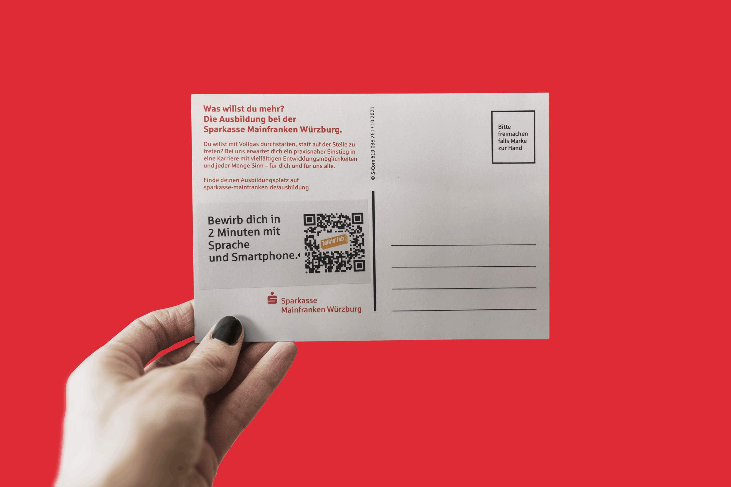 Im Projekt zur Rekrutierung von Azubis setzt die Sparkasse Mainfranken Würzburg auf die Sprachbewerbung von Talk’n’Job: eine niedrigschwellige, moderne und zeitgemäße Möglichkeit, sich in nur 2 Minuten zu bewerben. So erreichen sie mehr Kandidaten, sprechen Bewerber direkt an und steigern die Zahl der Bewerbungen spürbar.