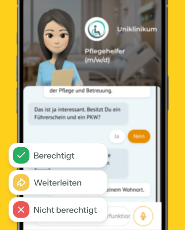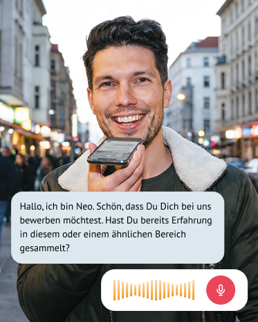 Nach dem Klick startet die Bewerbung sofort. Ohne Registrierung oder Dokumente beantworten Bewerber Fragen per Sprache am Smartphone – in wenigen Minuten und schichttauglich.