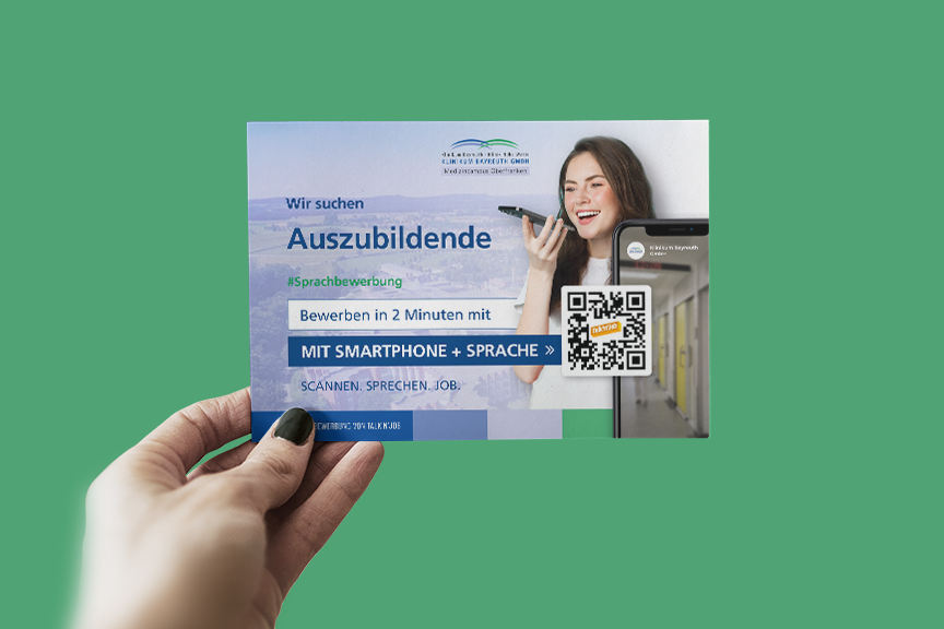 Veröffentliche deine Stellenanzeige mit einem Talk’n’Job-Link oder QR-Code und spiele den Bewerbungszugang online wie offline aus. So entsteht der erste Kontakt mobil und ohne Umwege.