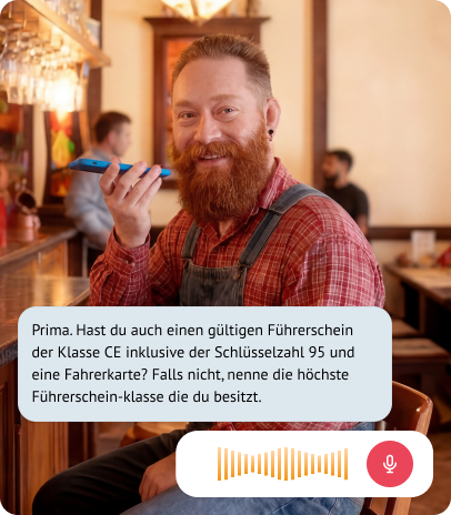 Nach dem Klick startet die Bewerbung sofort. Ohne Registrierung oder Dokumente beantworten Bewerber Fragen per Sprache am Smartphone – in wenigen Minuten und schichttauglich.